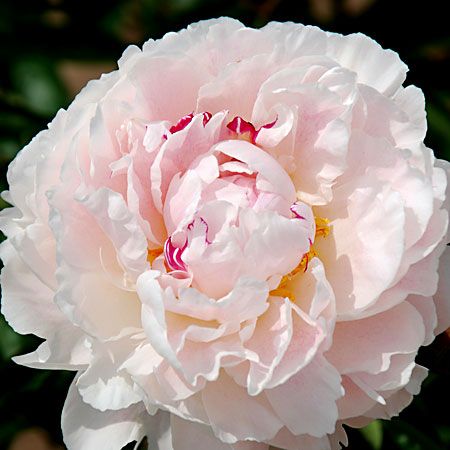 Цветки состоят из лепестков, без тычинок и пестиков (или они скрыты среди лепестков). Они румяно-белые и кремовые, с несколькими красными отметинами. Нижние лепестки крупного размера и достаточно широкие. располагаются в 1-2 ряда горизонтально или слегка отогнуты вниз. Все остальные лепестки узкие и образуют «бомбу». Размер цветка 15-16 см в диаметре. Цветоносы прочные. Каждый из цветоносов образует по три и более цветка. Куст аккуратный, но под тяжестью цветов может разваливаться. Поэтому тяжелые бутоны необходимо поддерживать стандартной опорой в виде кольца. Листья появляются весной бордового цвета, а затем – они становятся насыщено-зелеными. Они дважды тройчатые, заостренные, выглядят отлично на протяжении всего сезона. Этот сорт морозоустойчив (выдерживает понижения температуры до −40 °C) и устойчив к засухе. Высота взрослого растения – 80-90 см, а ширина – 45-50 см. В нашем интернет-магазине вы сможете купить Пион Травянистый Так же возможно вас заинтересуют Пион «Армани» и Пион травянистый Бразер Чак .